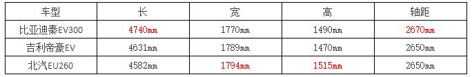 小编觉得空间和舒适是个充分必要的关系,怎么说呢?就是空间狭小,你的车设计在科学,人肯定也不会感觉到很舒服,但是舒适也不完全由空间决定。所以空间对于舒适来说是个必要条件,基于此点,小编就来讲讲乘坐感受吧。这次我们按价位来将车辆划分开。首先上场的一组是比亚迪秦EV300、吉利帝豪EV和北汽EU260,这三款车都是在补贴前20多万的车型,也都同属A级车市场(就是家轿)。我们通过一个表格先来了解一下三款车的参数。