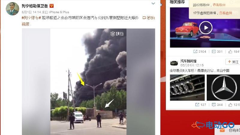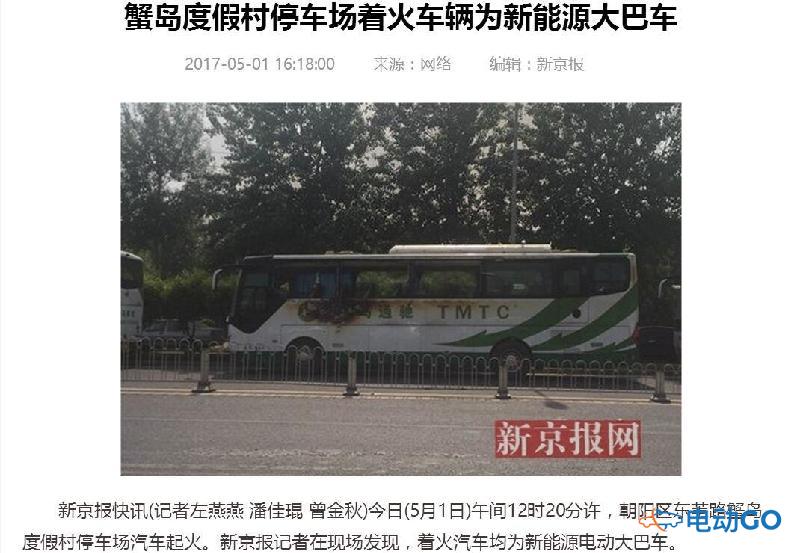 “朝阳区东苇路蟹岛度假村停车场汽车起火。新京报记者在现场发现,着火汽车均为新能源电动大巴车。在现场,着火汽车车身均写有“天马通驰TMTC”的字样,不远处设有一排充电桩。”