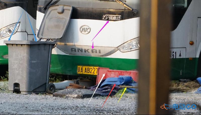 放大图片,2台车头向东并排停放的“安凯HFF6111K10EV型电动大巴”细节研判:车辆附近堆积这杂物(蓝色箭头);垃圾箱盖板翻起并依靠在“安凯HFF6111K10EV型电动大巴”车头前围板(黄色箭头);灭火装置存放杂乱无章;车顶沾满绪状物(红色箭头)。