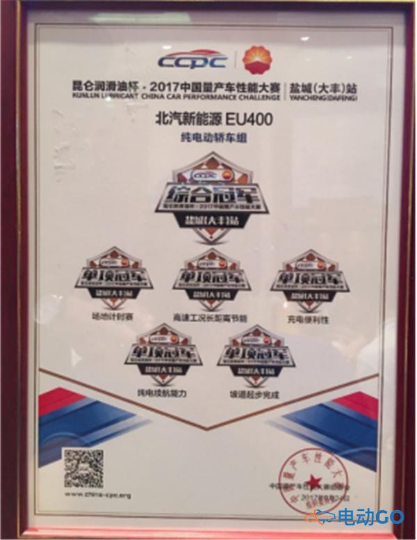 来自E组的北汽新能源EU400,继7月下旬克拉玛依站斩获充电便利性、经济性集结赛、场地计时赛、蛇形绕桩、麋鹿测试、0-200m加速、涉水性等7个分项第一名和首站综合冠军后,再次在场地竞速赛、续航里程赛、充电便利赛、高速长距离节能赛4个分项中折桂,凭借各分项比赛积分累计总积分第一,拿到CCPC盐城(大丰)站综合冠军。