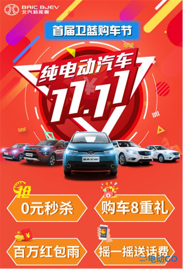 双十一期间,北汽新能源将举办首届线上微商城“卫蓝购车节”活动,11月7日至30日期间通过“卫蓝合伙人”店铺或微商城下单并完成支付的用户,可在提车时赢取CPCC冰雪之旅、小米电视4、华为mate10、京东卡等惊喜购车八重礼。