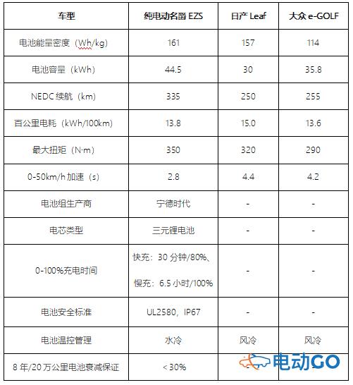 纯电动名爵EZS电池密度达到161wh/kg、0-50km/h实测加速只要2秒多、NEDC续航335km、快充30分钟充至80%电量,比目前全球新能源市场上口碑和销量表现均不错的日产Leaf、大众e-GOLF等同级车型。
