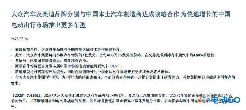 7月26日晚,一条大众和小鹏牵手的消息刷爆朋友圈和社交媒体,根据大众汽车发布的公告显示,大众与小鹏汽车签订长期合作技术框架协议,将向小鹏汽车注资约7亿美元(约合人民币50亿元),收购其4.99%的股份,未来将共同开发两款面向中国市场的大众品牌电动车型,有望于2026年在国内新能源汽车市场推出。