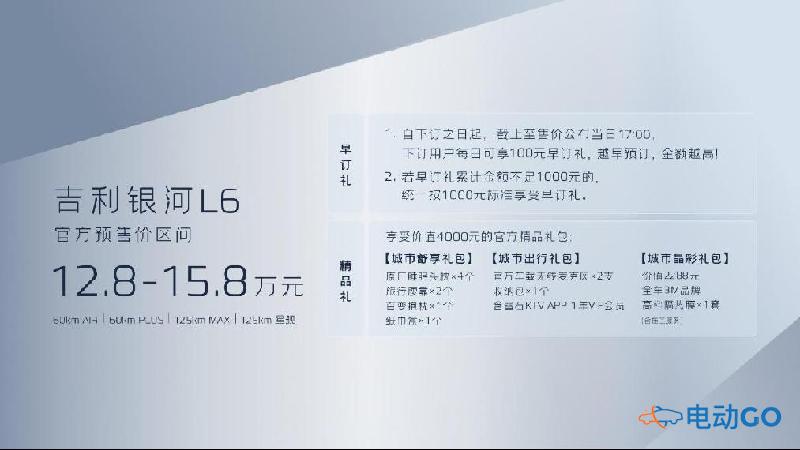 8月25日,吉利银河L6在成都车展正式开启预售,推出纯电续航60km AIR、60km PLUS、125km MAX和125km星舰四款车型,预售价区间为12.8~15.8万元,用户可以直接在吉利银河APP或小程序进行下订。在诚意十足的价格基础上,吉利银河L6还为用户推出丰厚的预订权益,凡是在预售期内下订并支付600元意向金的用户,即可享受两重礼:
